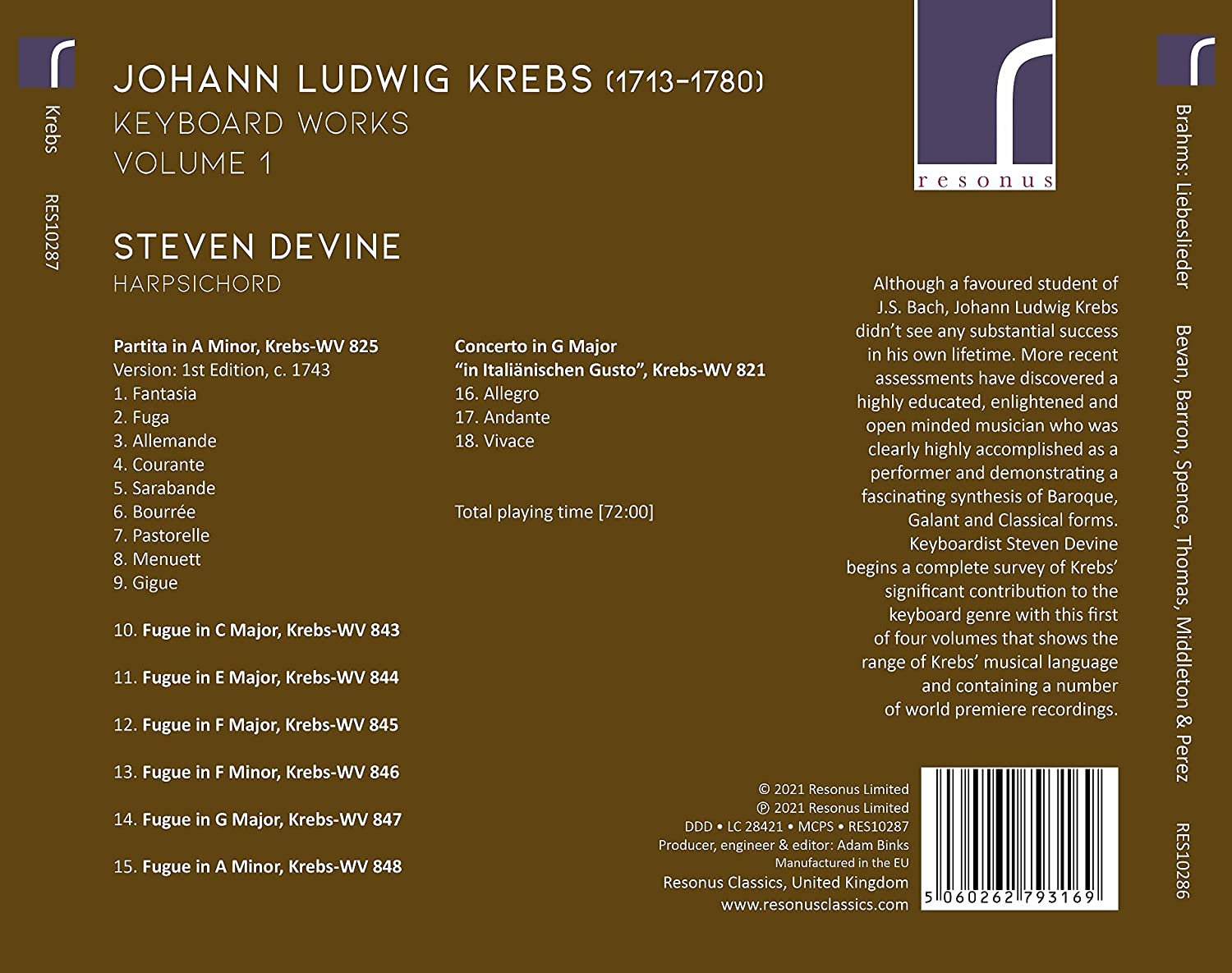 Although a favoured student of J.S. Bach, Johann Ludwig Krebs (1713 – 1780) didn’t see any substantial success in his own lifetime. More recent assessments have discovered a highly educated, enlightened and open minded musician who was clearly highly accomplished as a performer and demonstrating a fascinating synthesis of Baroque, Galant and Classical forms. Keyboardist Steven Devine begins a complete survey of Krebs’ significant contribution to the keyboard genre with this first of four volumes that shows the range of Krebs’ musical language and containing a number of world premiere recordings.