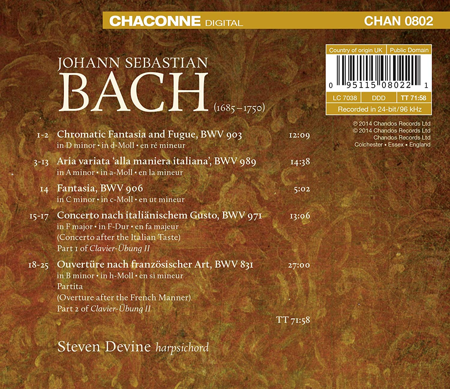 The ‘Italian’ Concerto and ‘French’ Overture included on this disc together make up the second part of Bach’s Clavier-Übung, composed, according to Bach himself, ‘for music lovers to refresh their spirits’. Here Steven Devine’s performances show that these works do far more than simply refresh spirits. The ‘Italian’ Concerto has long been thought a product of Bach’s extensive study of Vivaldi’s concerti. It is full of allusions to the style of the Italian orchestral concerto but the idiomatic keyboard writing, particularly in the exquisitely ornamented slow movement, clearly shows the work’s conception as a virtuoso keyboard piece. The large scale of the ‘French’ Overture’s opening movement is unprecedented in the work of Bach, being his longest single keyboard movement. It is grandiose and imposing in character and stands in contrast to the seven shorter, more delicate dance movements that follow. Alongside these large-scale works are the Aria variata ‘alla maniera italiana, the Chromatic Fantasia and Fugue, BWV 903, and the Fantasia in C minor, BWV 906.